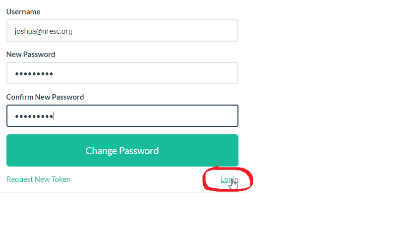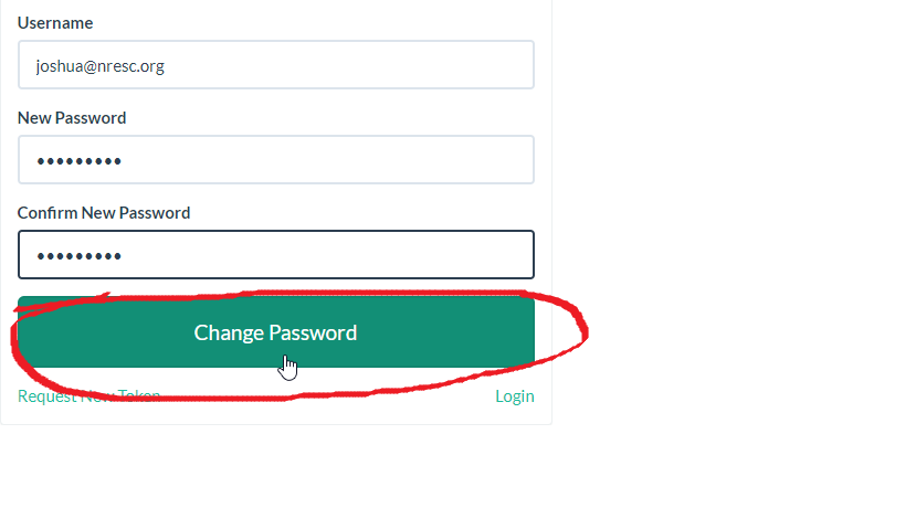 - Type in your nresc.org email address in the username field. Enter your desired password in the “New Password” field, then enter it again in the “Confirm New Password” field. Once entered, select “Change Password”.